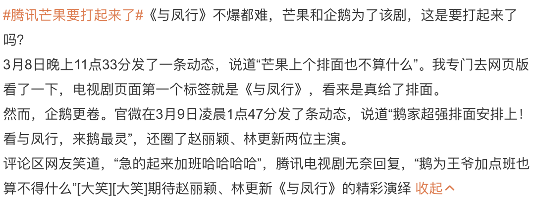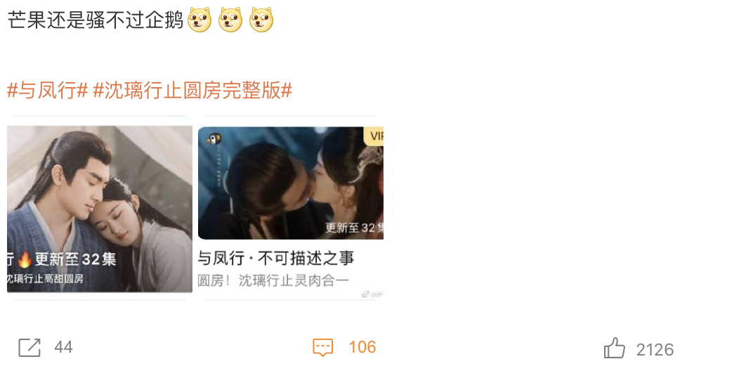 在这场圆房大戏中,芒果和企鹅两大播放平台也伸开了强烈的竞争。要知谈《与凤行》开播的时分,两家就照旧暗戳戳的掐起来了。